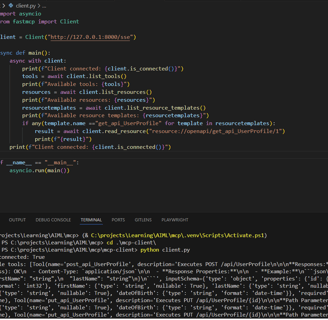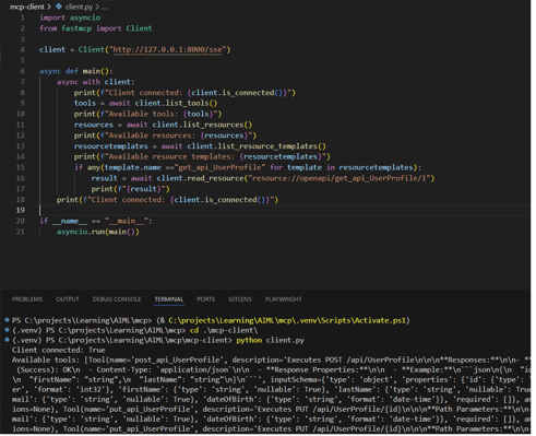 with the above steps once the server is up and running, we can use the mcp client to connect to this server as per below code snippet