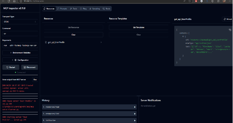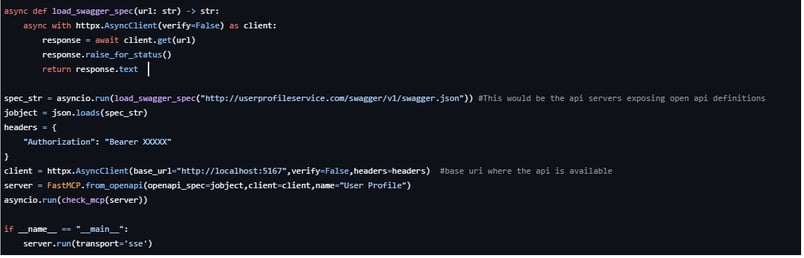 We are using FastMCP python SDK to convert the OpenAPI definition of the routes available in a webAPI to an MCP standarad Tools,Resources and Resource template. load_swagger_spec function extracts the OpenAPI definition using a published swagger json File. Then we create basic httpx client using the base uri and any additional headers required for authentication/authorization. we use the FastMCP.from_openapi with all this details to create a mcp server instance. we run a sample to check if mcp server is pulling all the relevant details. In this example we are using sse as our transport protocol.